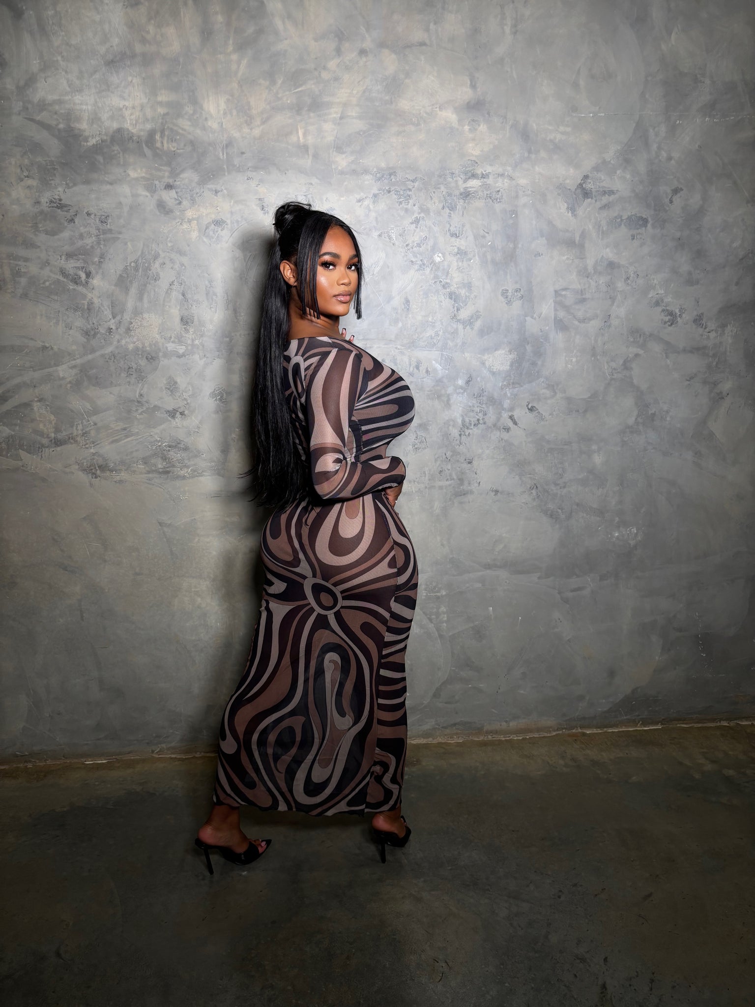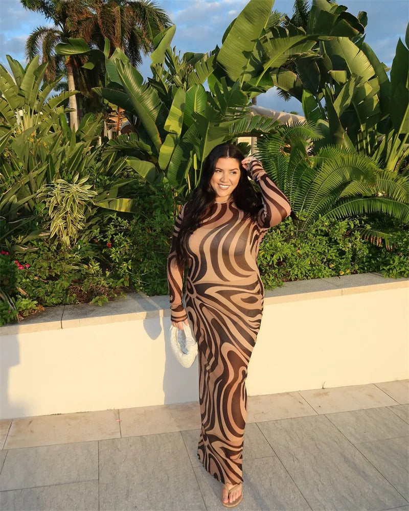 See-through, super stretchy mesh printed dress with a body-hugging fit. Model