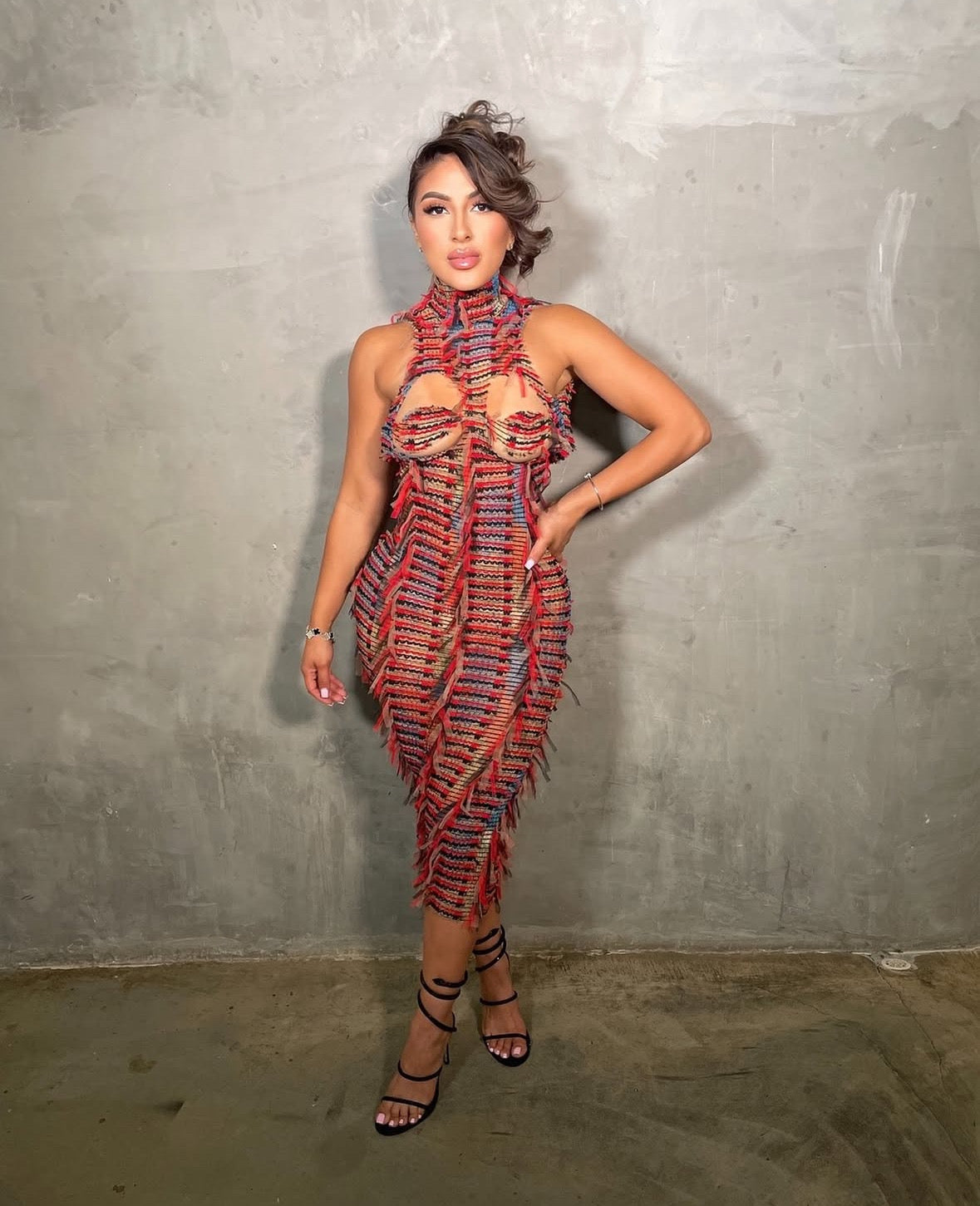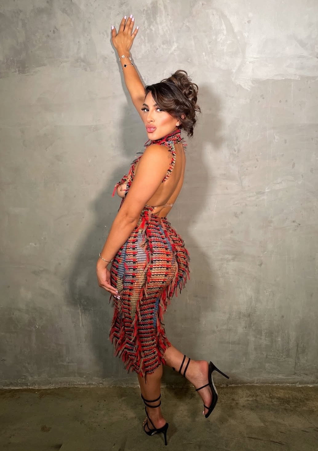 has a clear adjustable elastic strap on the back to cinch the dress in! Cassie has on a Small